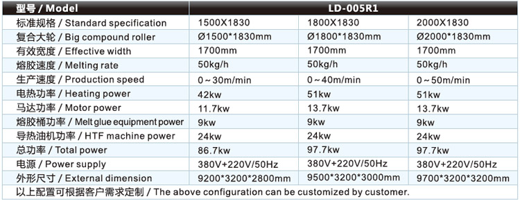 | 熱熔膠復合機/貼合機-固體顆粒熱熔膠復合機/貼合機LD-005R1 的主要技術參數 / Major technical parameters |
