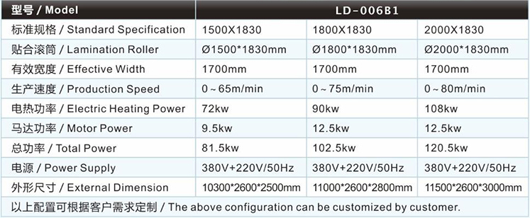| 水膠復合機/貼合機-立式雙輪雙網(wǎng)單槽水膠高速泡棉復合機/貼合機LD-006B1的主要技術參數(shù) / Major technical parameters |