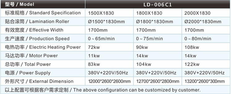 | 水膠復(fù)合機(jī)/貼合機(jī)-臥式雙輪雙網(wǎng)雙槽水膠高速泡棉復(fù)合機(jī)/貼合機(jī)LD-006C1的主要技術(shù)參數(shù) / Major technical parameters |